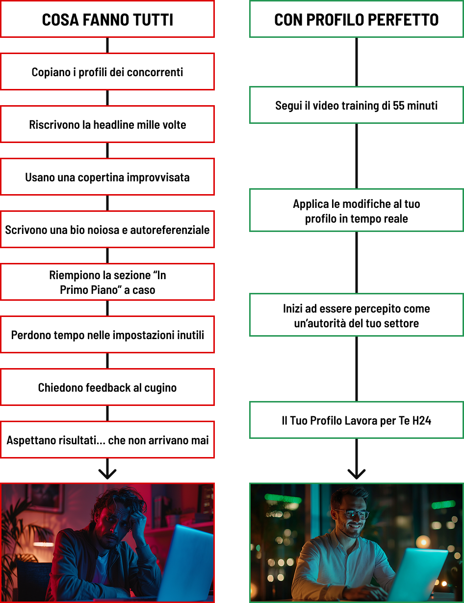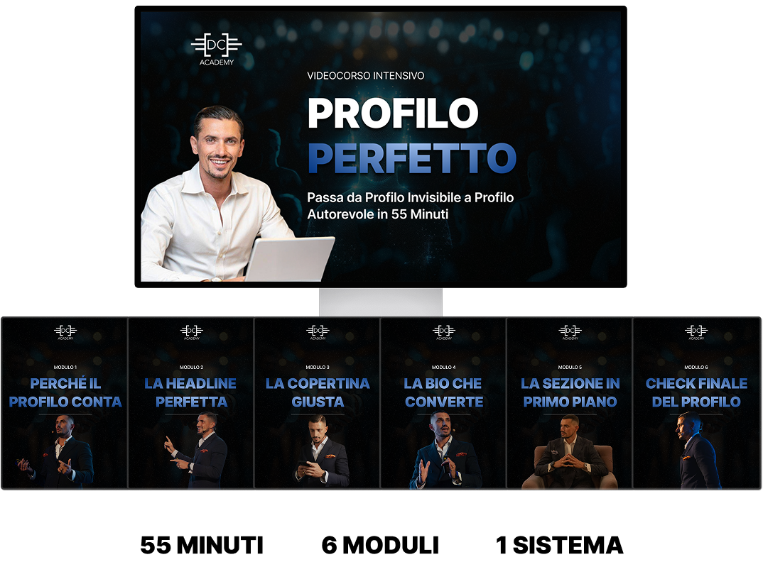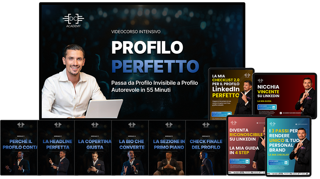 Questa non è la solita formazione teorica piena di concetti astratti o storie che non ti servono. Profilo Perfetto è una guida pratica e completa, pensata per trasformare subito il tuo profilo LinkedIn in uno strumento che attira clienti di alto livello.
