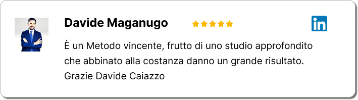 Un profilo LinkedIn che trasmette immediatamente autorevolezza e professionalità, capace di attirare clienti e collaborazioni di alto livello. Diversi professionisti che hanno seguito il metodo hanno iniziato a ricevere richieste di consulenza e proposte di collaborazione in pochi giorni.
